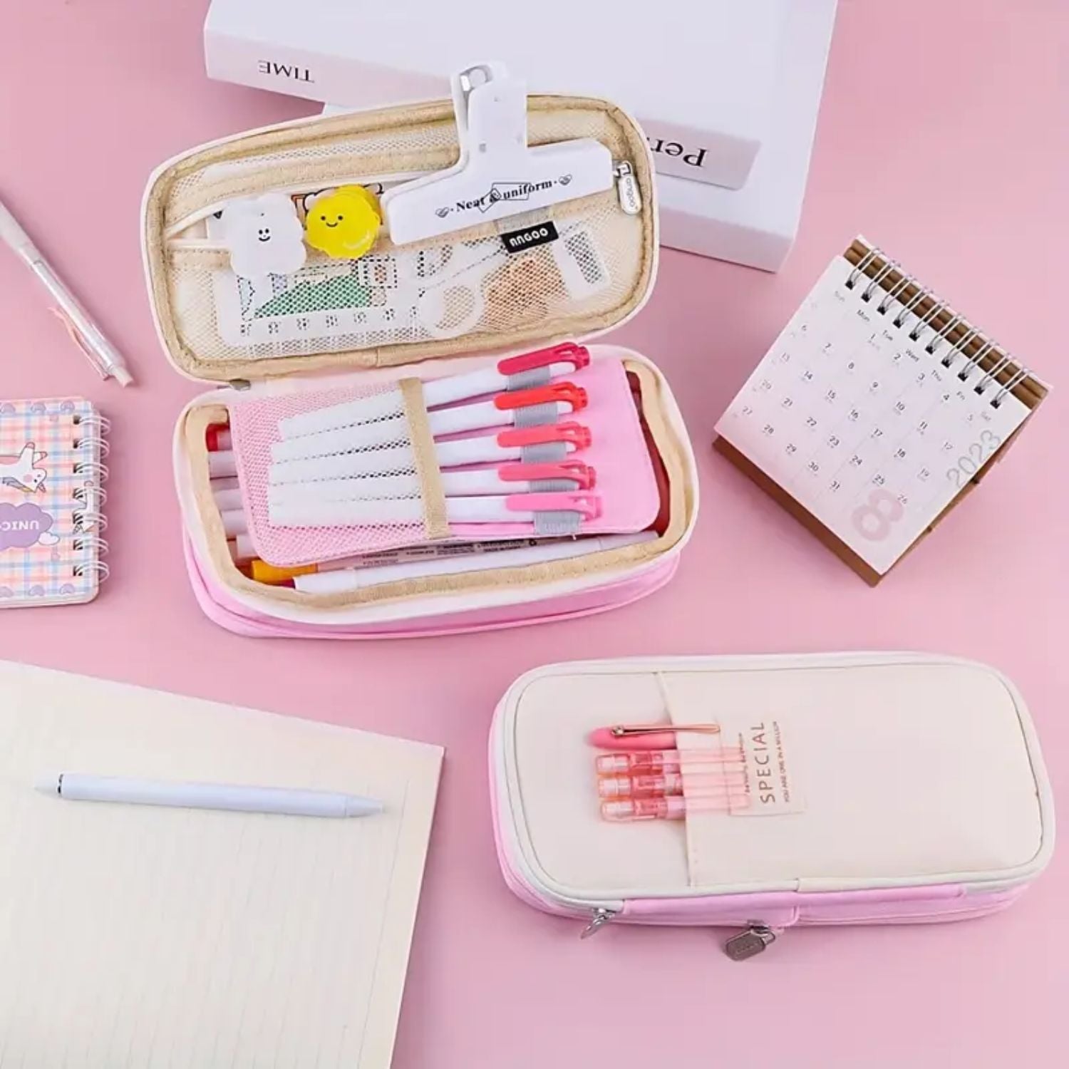 1: Stay organized with this large capacity polyester pencil case featuring a double-layer zippered design.