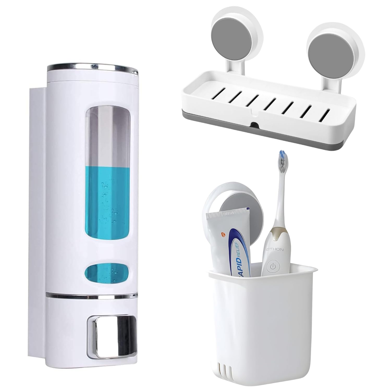 1: Wall-Mounted Soap Holder & Toothbrush Holder: Keep your bathroom organized with a liquid soap dispenser and brush stand.