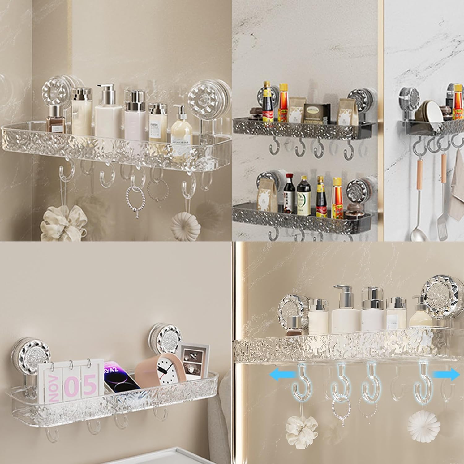 CONVENIENT HOOKS : Multiple hooks underneath the shelves for hanging loofahs, towels, and other bathroom accessories